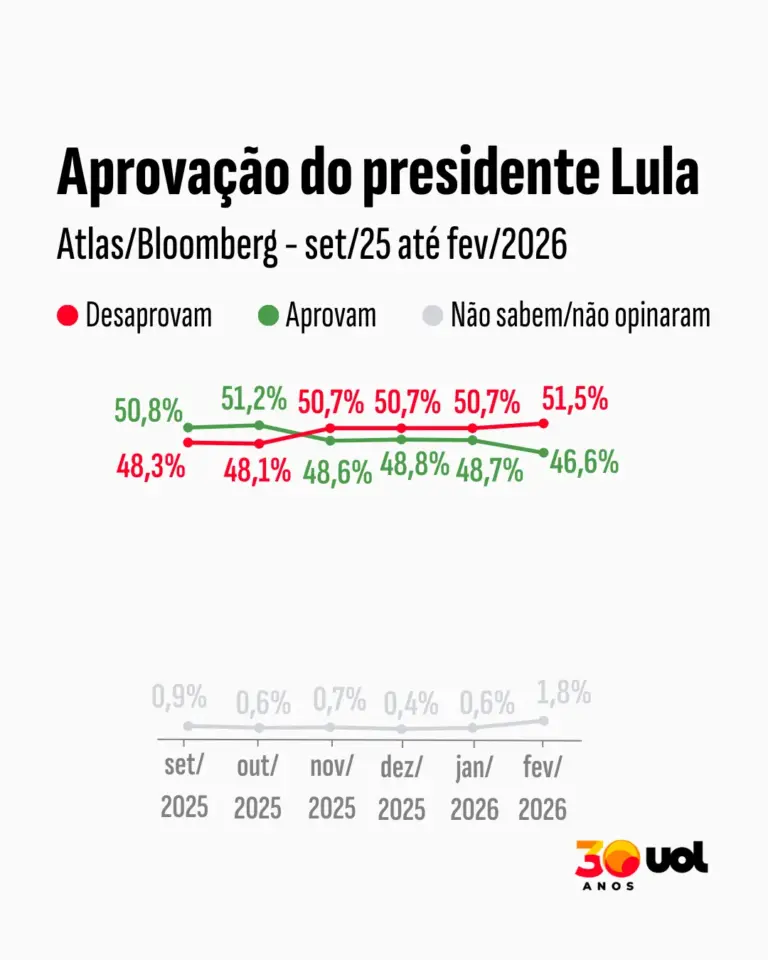 Fica claro que a pesquisa aponta Lula em queda no recorte eleitoral. Contudo, há um detalhe relevante: na avaliação de governo, os índices de aprovação e desaprovação permanecem praticamente os mesmos em relação a janeiro. O mesmo ocorre com os indicadores de ótimo + bom e ruim + péssimo.