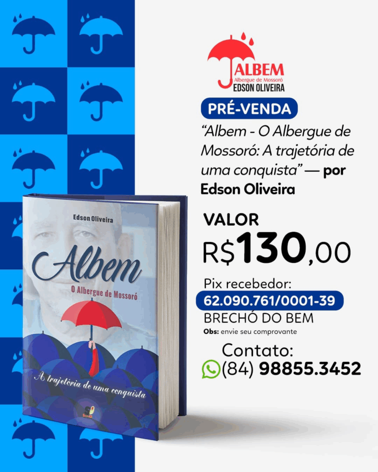 Agende aí: será amanhã, às 19h, no auditório da OAB Mossoró, o lançamento do livro “Albem – o albergue de Mossoró: a trajetória de uma conquista”, de autoria de Édson Oliveira. A obra conta a história do Albergue, desde sua idealização até os dias atuais.